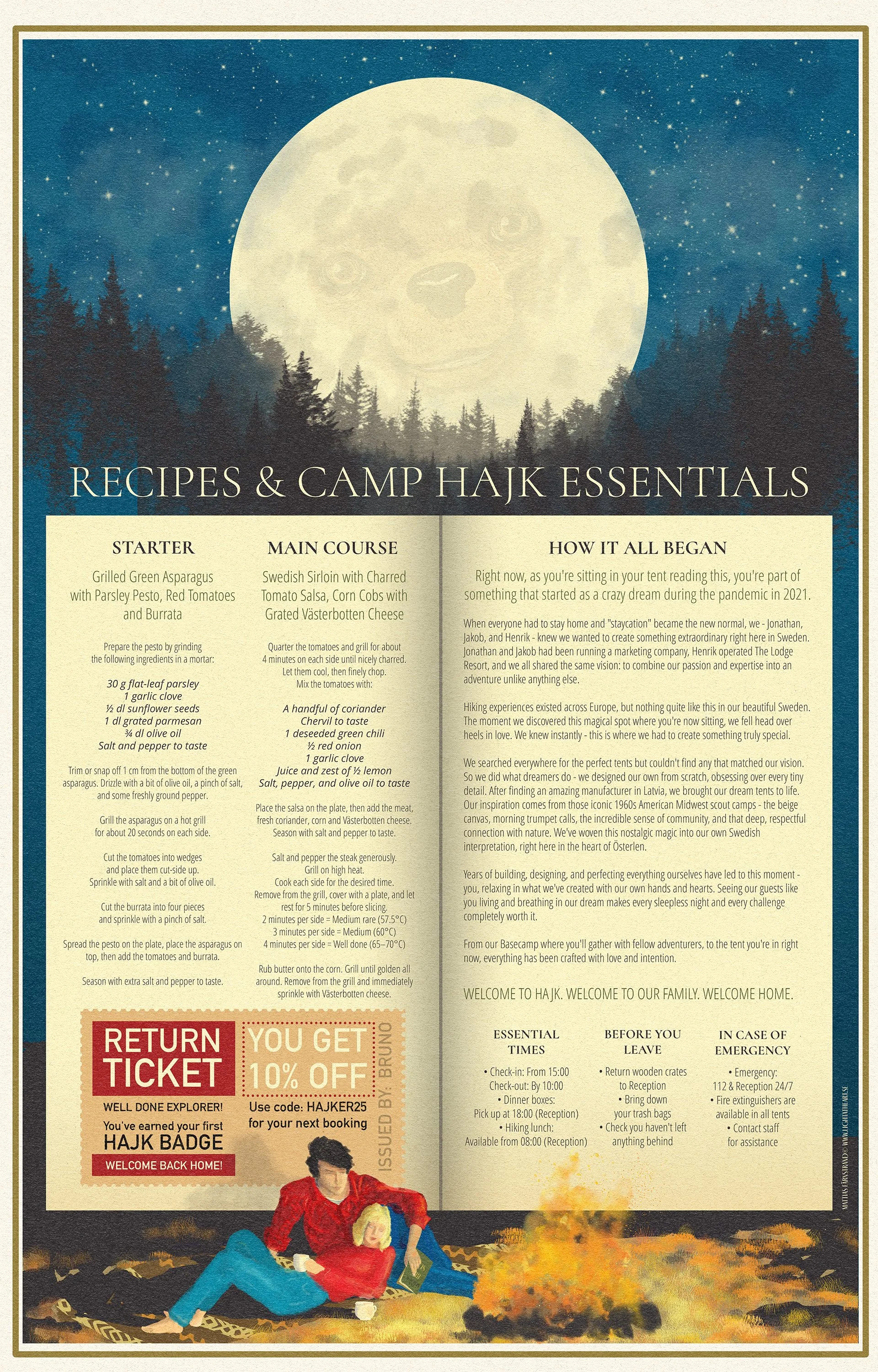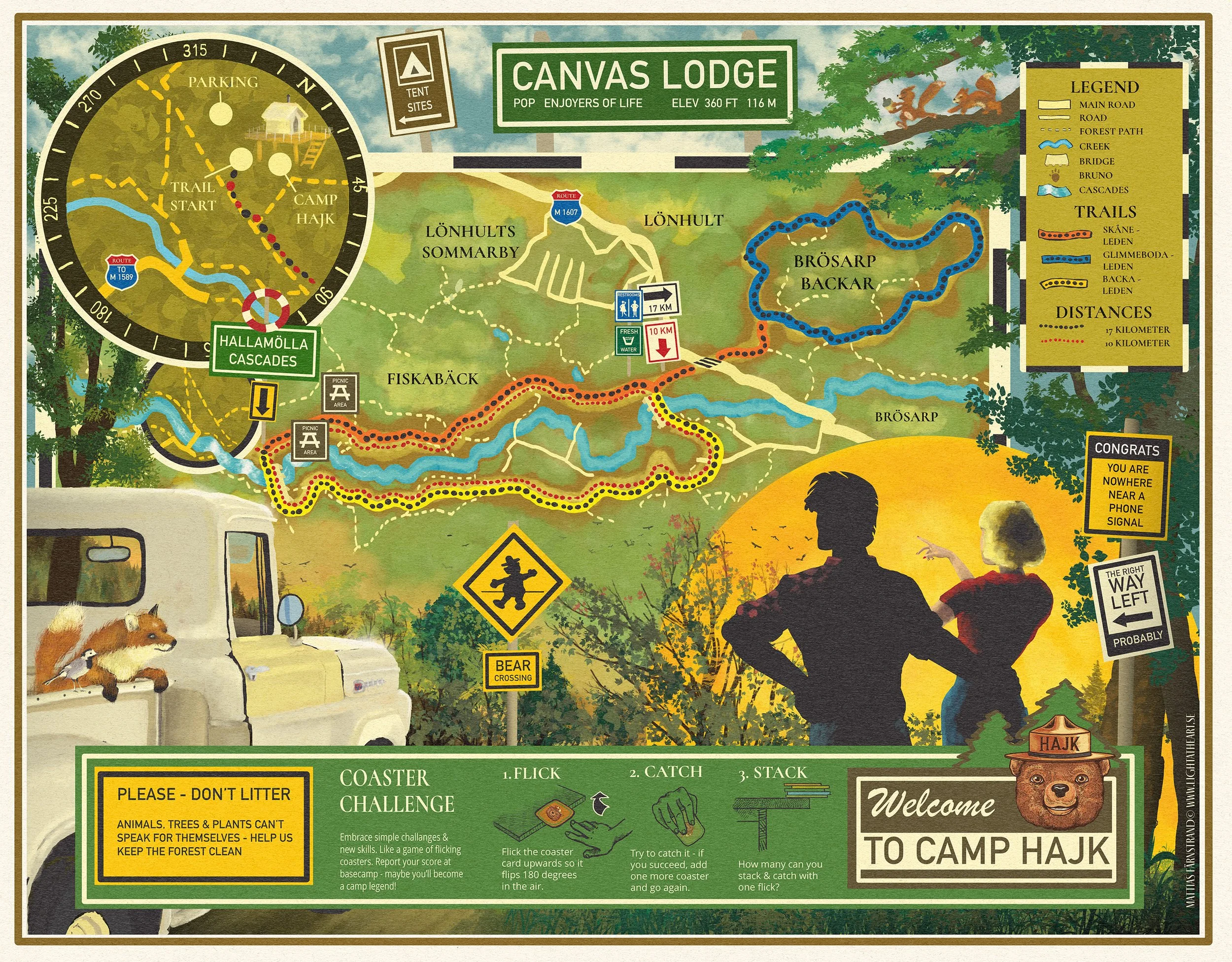 Illustrations for Hajk, the unique canvas lodge and hiking experience in Österlen Sweden. The illustrations were printed in The Hajk Gazette, a magazine provided to visitors.